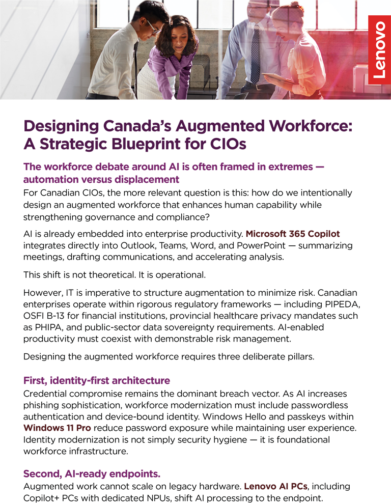 The workforce debate around AI is often framed in extremes — automation versus displacement For Canadian CIOs, the more relevant question is this: how do we intentionally design an augmented workforce that enhances human capability while strengthening governance and compliance?